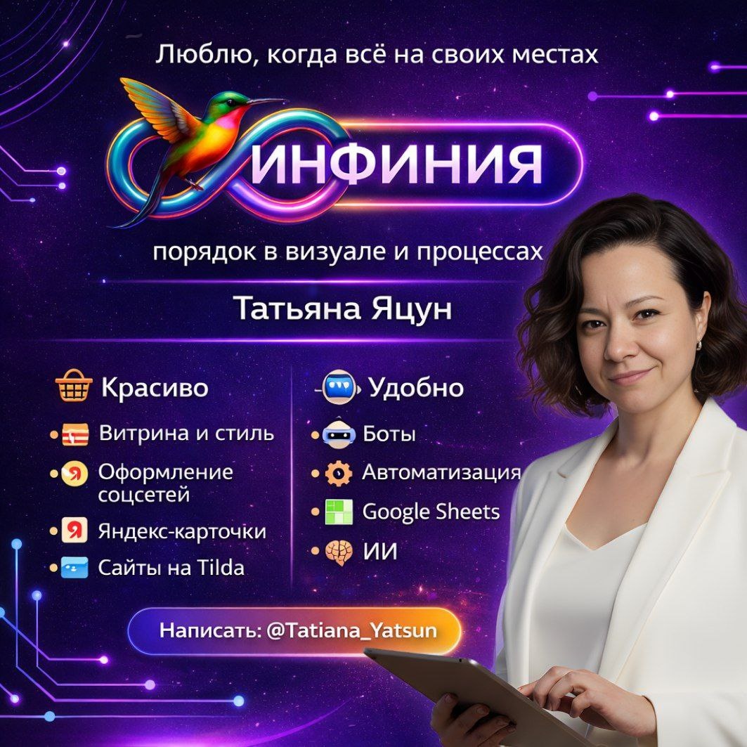 🤍 Меня зовут Татьяна Яцун. Я собираю порядок там, где обычно хаос: в оформлении, в структуре, в процессе. Чтобы было приятно смотреть — и легко пользоваться. 🎨 Красиво (витрина и стиль) — брендбук, визуальная система, аккуратные шаблоны — оформление соцсетей без визуального шума — Яндекс-карточки, чтобы было уверенно и понятно — сайты на Tilda — простые, ясные, “по делу” ⚙️ Удобно (чтобы меньше ручного) — боты: запись, заявки, ответы, напоминания — автоматизация рутины: таблицы, шаблоны, небольшие сценарии — настройка так, чтобы “один раз сделали — дальше работает” 🌿 Это подходит и для работы, и для дома: бизнесу, проектам, учёбе, личным задачам — везде, где хочется меньше суеты и больше ясности. 🔁 В этом канале буду показывать — примеры оформления “до/после” — заметки про Яндекс-карточки и витрину — простые схемы автоматизаций и ботов — шаблоны и находки, которые можно забрать себе 💬 Я на связи: @Tatiana_Yatsun 🔗 ВК 📢 МАКС 🔥 САЙТ