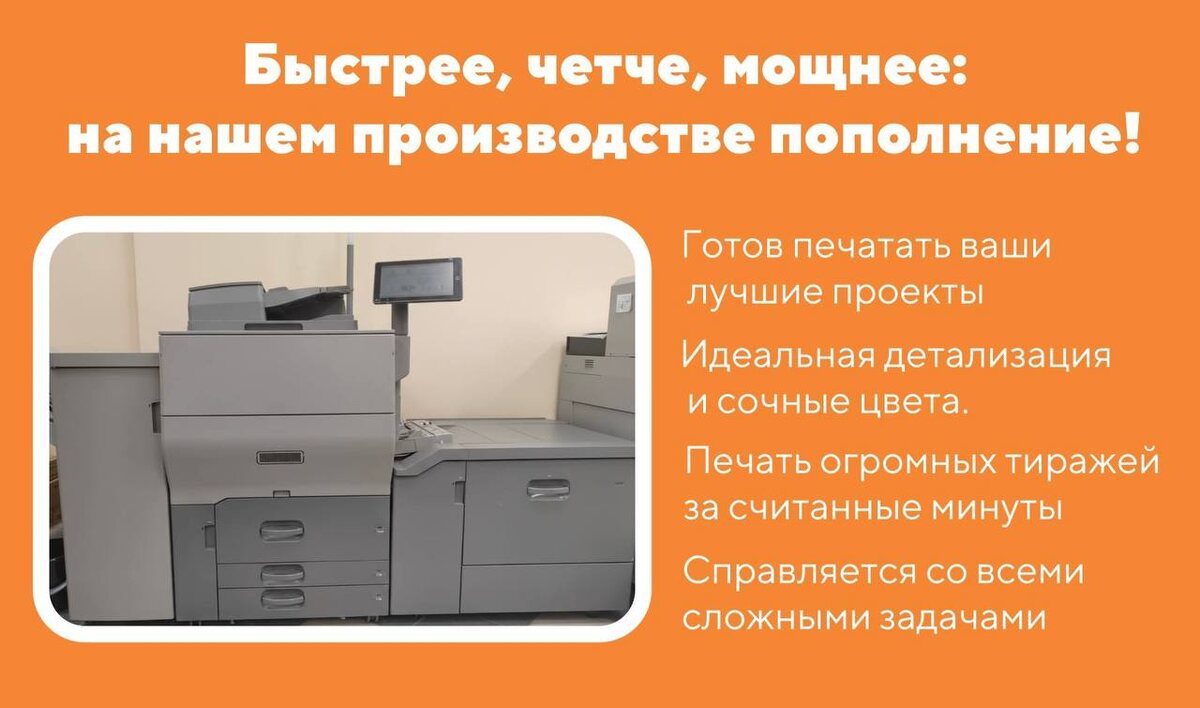 Знакомьтесь - это наш новый принтер, и он готов перевернуть ваше представление о скорости и качестве печати. Его преимущества: Скорость: Теперь даже самые объемные отчеты и презентации будут готовы быстрее, чем вы успеете допить свой кофе 🚀 Качество: Четкость линий и цветопередача - просто на высоте🔝 Ваши идеи заслуживают идеального воплощения! Мы постоянно обновляемся, чтобы работать было приятнее, а результат - безупречнее. 🖨️✨