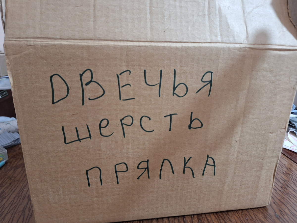Вскрыла, а там моя прялка лежит себе, ждёт , когда она мне понадобится. Я как-то уже не знаю, сколько лет назад пыталась на ней попрясть, маленько поработала и всё, настроение пропала. Вот так и стоит она, даже с готовыми нитками. Я бы может и допряла, но никто не хочет такие носки носить, получаются они колючие и толстые, в сапоги и красовки не оденешь. Вот и убрала её подальше, выкинуть жалко стало. А теперь, когда все пытаются что-то из своих старых запасов продать на Авито-решила тоже попробовать, а вдруг кому-то понадобится. Вместе с прялкой были упакована шерсть овечья и ещё чья-то, может собачья, может козы-я когда то держала пуховую козу.