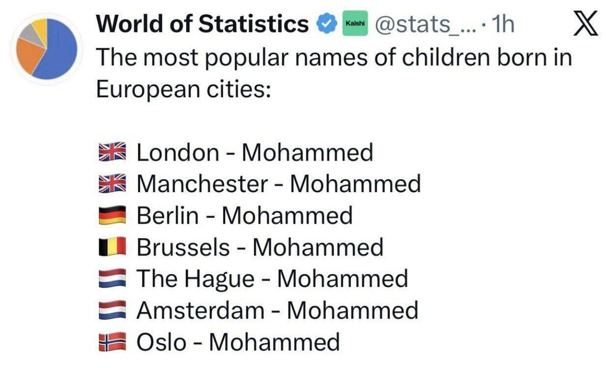 ⏺Имя Мухаммед стало самым популярным среди новорождённых в Евросоюзе