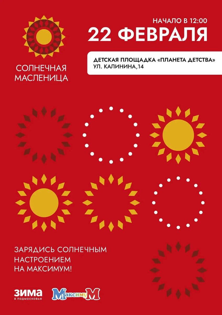 ! 🥞 Устали от зимы? Мы знаем, как поднять настроение! Приглашаем вас на весёлые гуляния в честь Масленицы! ⏰ Когда: 22 февраля в 12:00 📍Место встречи: детская площадка «Планета детства» (ул. Калинина, 14) Приходите всей семьёй! Будем провожать зиму и встречать весну вместе! Зарядитесь солнечным настроением на максимум вместе с нами! ☀️ До встречи на празднике! #Масленица #МаксимуМ #ПланетаДетства