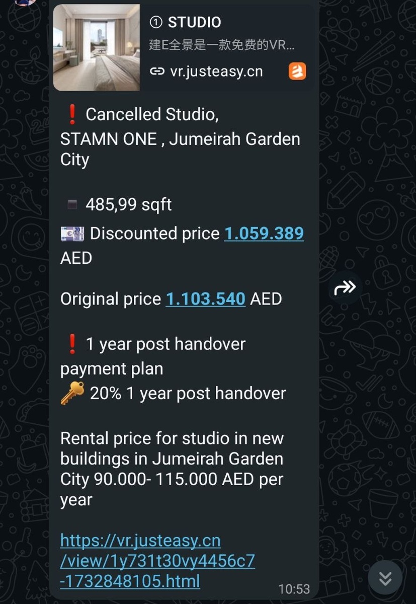 е. отмены. Кто-то забронировал, по тем или иным причинам отказался от покупки, и застройщик присылает юнит со старой ценой. Вот это отличная возможность для инвестиций. Большинство таких юнитов до открытого рынка не доходят. Быстро улетают среди агентов. Студия в супер-перспективном Jumeirah Garden City (обзор районов сделаю позже, и этот будет в топе) с ключами через год всего за миллион -- это круто. Виртуальный тур по квартире: https://vr.justeasy.cn/view/1y731t30vy4456c7-1732848105.html Так тут ещё и post-handover. Год рассрочки после получения ключей 🏘🔑😎👍