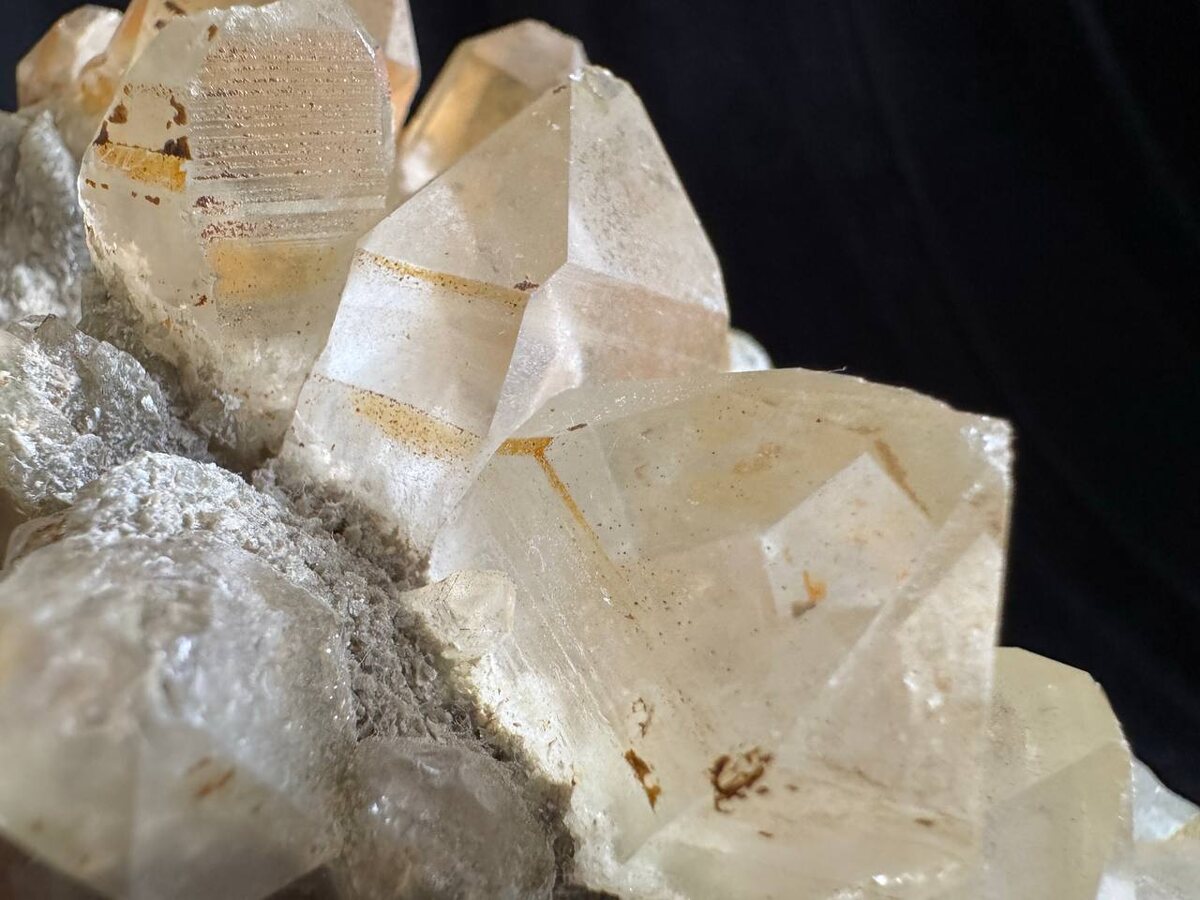 У этого экземпляра заметен тёплый оттенок — не «жёлтый», а скорее мягко-шампань, который в боковом свете становится особенно читаемым. На отдельных гранях видны рыжевато-коричневые природные следы (типичные для железистых налётов/включений), а внутри некоторых кристаллов — лёгкие дымки. В одном из ракурсов просматриваются локальные радужные отблески — не как «спецэффект», а как тонкая оптика на микроплоскостях/микротрещинках.