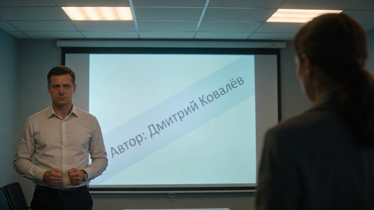 Каждый слайд. Каждый. На каждом – водяной знак. Полупрозрачный. «Автор: Дмитрий Ковалёв». На ноутбуке, если не приглядываться – не видно. Фон съедает. Но на проекторе, на белом экране в переговорной, при полной яркости – проступает. Чётко.