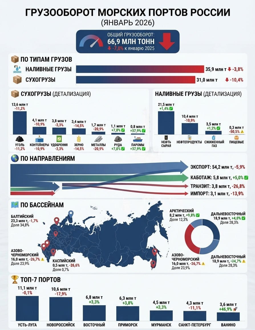 АМТП: общий грузооборот 66,9 млн тонн (-7,0% к январю 2025)