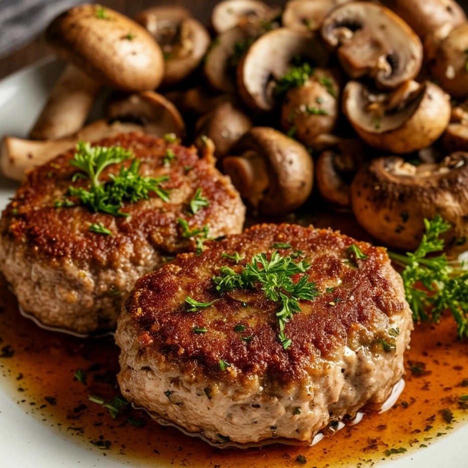 3. Сформируйте из фарша лепешки диаметром около 8 см. На середину каждой лепешки положите начинку из грибов и сыра.