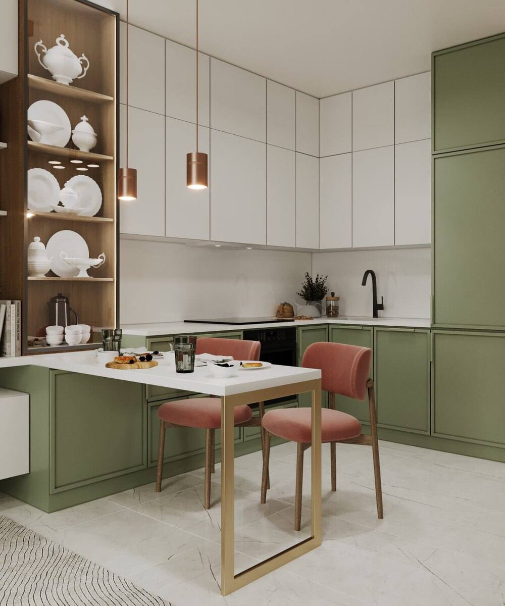 🌱 Оливковые фасады, тёплое дерево и латунные акценты создают спокойный, уютный характер пространства. Лёгкая витрина с подсветкой добавляет глубины, а текстиль и мягкая мебель смягчают строгую геометрию кухни. Компактная планировка продумана до мелочей: максимум мест для хранения. Современная визуализация интерьера от студии «Дизайн СПб». Наш контактный номер телефона: +7 (812) 670-07-47