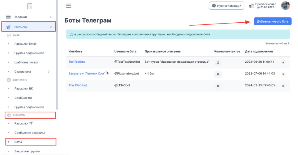 - Зайдите в раздел «Рассылки → Telegram → Боты»
