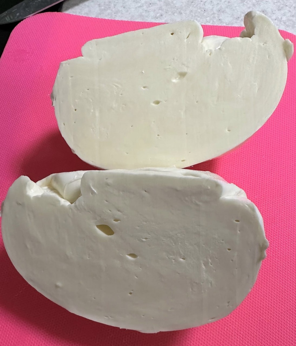 , Посмотрите на фотографии Моцареллы. Форма нормальная, поверхность гладкая, шарик не совсем ровный, но это не проблема. А вот внутренняя текстура сыра неидеальна. Она плотная ровная, без слоев. Нет сочности, которая является отличительной чертой отличной Моцареллы. Есть идеи почему так получилось? Что надо делать, чтобы избежать такой плотной текстуры? Чтобы всегда оставаться на связи 🇷🇺 Подпишись на наш канал в МАХ
