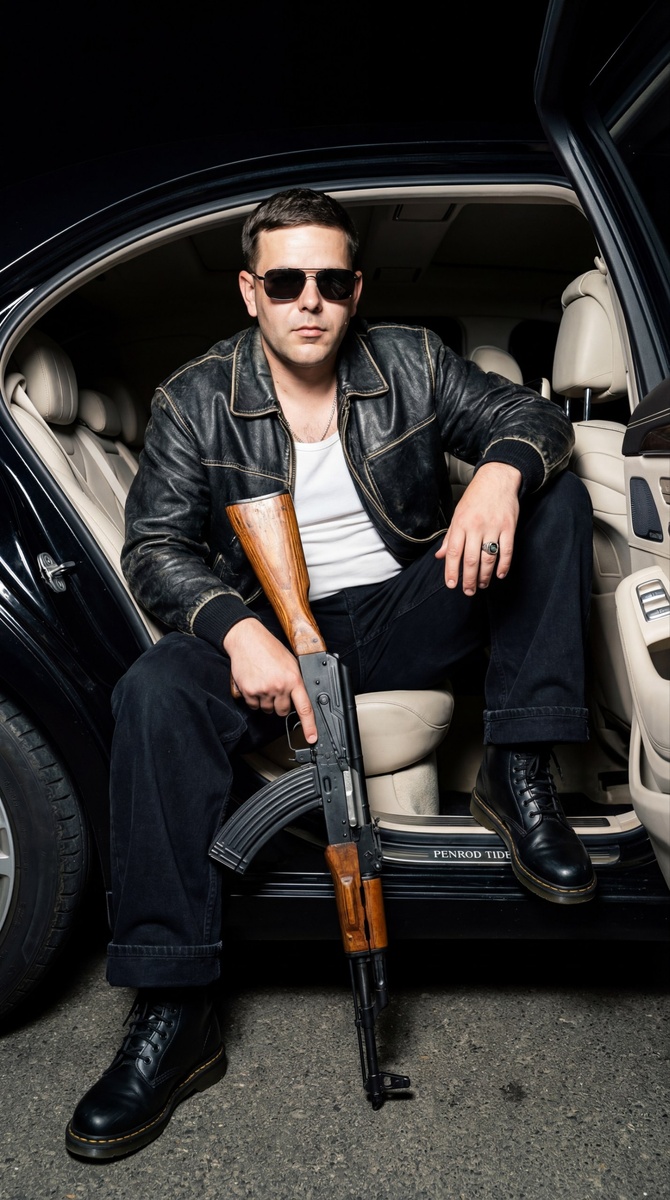 🤖Генерировать можно здесь: 👉БОТ ДЛЯ ГЕНЕРАЦИИ Выбираем режим Nano Banana Pro ИНСТРУКЦИЯ Молодой мужчина с референсного фото, уверенный и холодный взгляд сквозь тёмные прямоугольные солнцезащитные очки (в стиле «авиаторы» или «квадратные»), нейтральное, почти вызывающее выражение лица — без улыбки. Он сидит в открытом заднем дверном проёме чёрного люксового седана (например, Mercedes-Benz S-Class или BMW 7 Series), ноги вытянуты, одна рука лежит на колене, другая крепко держит автомат Калашникова АК-47 с деревянным прикладом и цевьём, металлической коробкой и чёрным магазином — оружие стоит вертикально между ногами, ствол направлен вверх. Одет в потёртую чёрную кожаную куртку-бомбер с контрастной светлой строчкой по воротнику и манжетам, под ней — белая хлопковая майка-безрукавка, чёрные широкие джинсы с завышенной талией и отворотами, чёрные ботинки Dr. Martens с жёлтой строчкой. На правой руке — серебряное кольцо с камнем (например, с бриллиантом или топазом). Фон: глубокая ноч