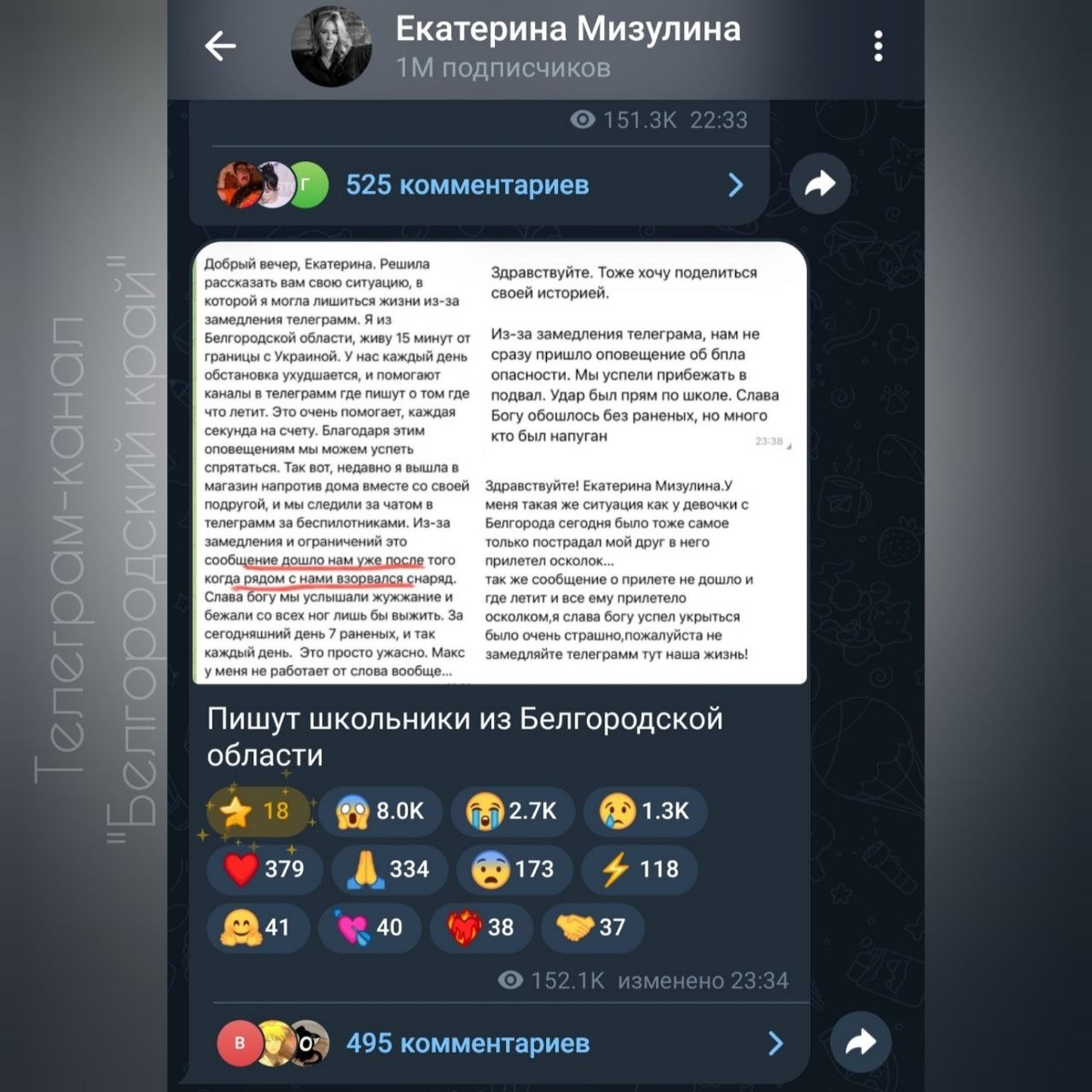 🔹 ЖИТЕЛИ БЕЛГОРОДСКОЙ ОБЛАСТИ ПИШУТ ЕКАТЕРИНЕ МИЗУЛИНОЙ: «Из-за замедления Telegram мы теряем минуты, а иногда и жизни». В редакцию Мизулиной продолжают поступать тревожные сообщения из приграничных районов. Подписчики из Белгородской области просят донести до властей одну просьбу: не замедлять Telegram. Для них это не вопрос удобства, а вопрос выживания. ➡️«Сообщение пришло уже после взрыва». Девушка, живущая в 15 минутах от границы с Украиной, рассказала, что они с подругой следили за чатом с оповещениями о БПЛА. Но из-за замедления мессенджера сообщение пришло, когда снаряд уже разорвался рядом. «Слава Богу, услышали жужжание — бежали со всех ног. За сегодня 7 раненых. Макс у меня не работает от слова совсем», — пишет она. ➡️Удар по школе. Ещё одна жительница области сообщает: оповещение об опасности пришло с задержкой. Люди успели спуститься в подвал. Взрыв пришёлся прямо по зданию школы. Раненых удалось избежать, но ударная волна и страх останутся в памяти надолго. ➡️«Другу п