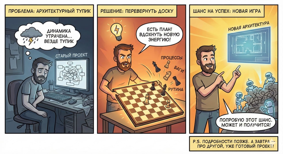 Грубо говоря, в одном проекте архитектурно довольно давно подход в целом неправильный, там надо по сути всё менять. Проект тянется уже очень долго, но прямо результата «вау» нет, в общем, с ним надо что-то менять. Я пытался много раз поменять в процессах некоторые моменты, но, как я вижу, это по сути всё ведёт так или иначе в тупик. Невозможно динамично что-то делать, динамика утрачена и, похоже, безвозвратно. В общем, в том проекте сейчас появился план, как вдохнуть энергию через не самое простое решение, но всё же есть шанс. Я попробую этот шанс и перевернуть по сути шахматную доску. Может и получится. Но это полемика, по одному проекту вот такая ситуация, показывать, что за проект, пока не буду, но позже подсвечу. Главное, чтобы энергии на все хватило 😂 В следующем посте как раз расскажу про другой проект, который понадобился одному клиенту, и да, он уже готов.