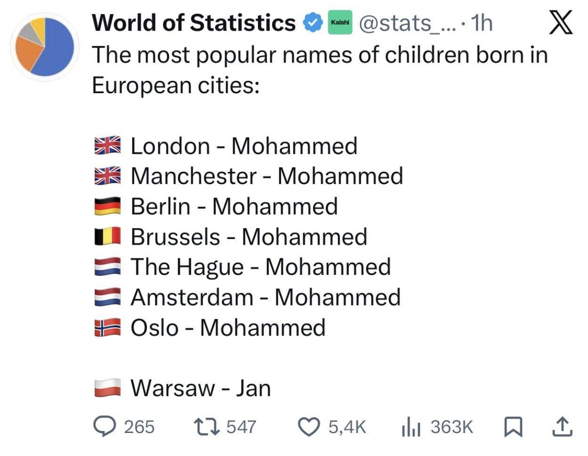 Имя Мухаммед стало самым популярным среди новорождённых в Евросоюзе, следует из данных World of Statistics
