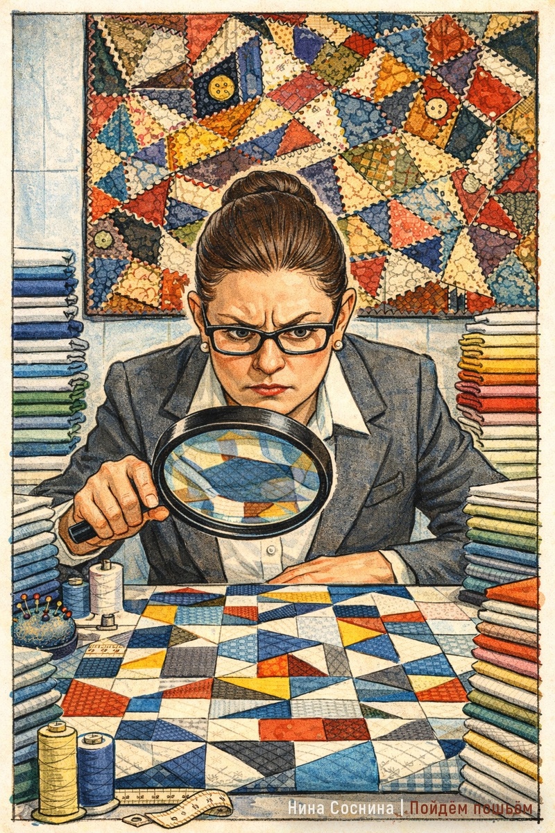 Знакомая ситуация? Вы публикуете фото одеяла, и кто-то с лупой находит стык, где полоски разошлись на полмиллиметра. «Уголки не сходятся». И вы чувствуете себя бракоделом. Стоп. Вы не бракодел. Скорее всего, эта критика говорит о чужом восприятии, а не о вашей работе. Мастер - не тот, у кого нет погрешностей, а тот, чьи погрешности выглядят как авторский почерк. Машинная строчка - метроном. Ручная - дыхание. Где-то быстрее, где-то медленнее. Вы нашли неидеальный стык в своей работе. Если вы выбрали первый - вы отличный оператор швейной машины.