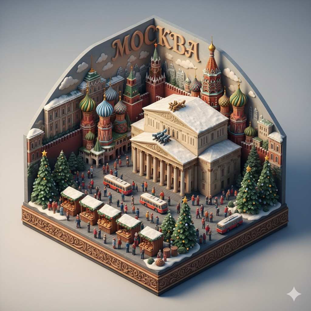 Высокодетализированный глиняный рельефный мир Москва во время Новогодних праздников. Многоуровневая трехмерная композиция: на заднем плане изображен культовый горизонт с Красной площадью и Кремлем, на среднем - Большой театр с роскошными колоннами и лепниной, на переднем плане - новогодние ярмарки, традиционные продуктовые лавки, миниатюрные люди в зимних нарядах, троллейбусы и сезонная зеленая ель и снежные сугробы. Рельефный текст "Москва" венчает сцену. Платформа: тонкий глина с резьбой по краям. УГОЛ ОБЗОРА: изометрический, глиняная визуализация Pixar-качества, СТИЛЬ: богатая цветовая палитра, текстура тисненой бумаги, уютная миниатюра в сочетании с коммерческим дизайном высокой плотности, мягкое студийное освещение, чистый нейтральный фон.