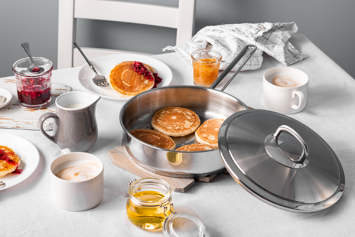 Классический русский рецепт с современным прочтением. В качестве припёка подойдут зелёный лук с яйцом, яблоки с корицей, грибы или ветчина с сыром. Универсальная сковорода линии "Традиция" подойдет для приготовления начинки, а блинница из той же коллекции - для выпечки блинов.
