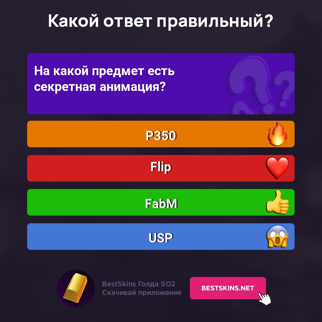 Отвечай на вопросы и фарми голду! Выбери ответ — ставь реакцию: 🔥 ❤️ 👍 😱 📲 Скачать - https://bestskins.net