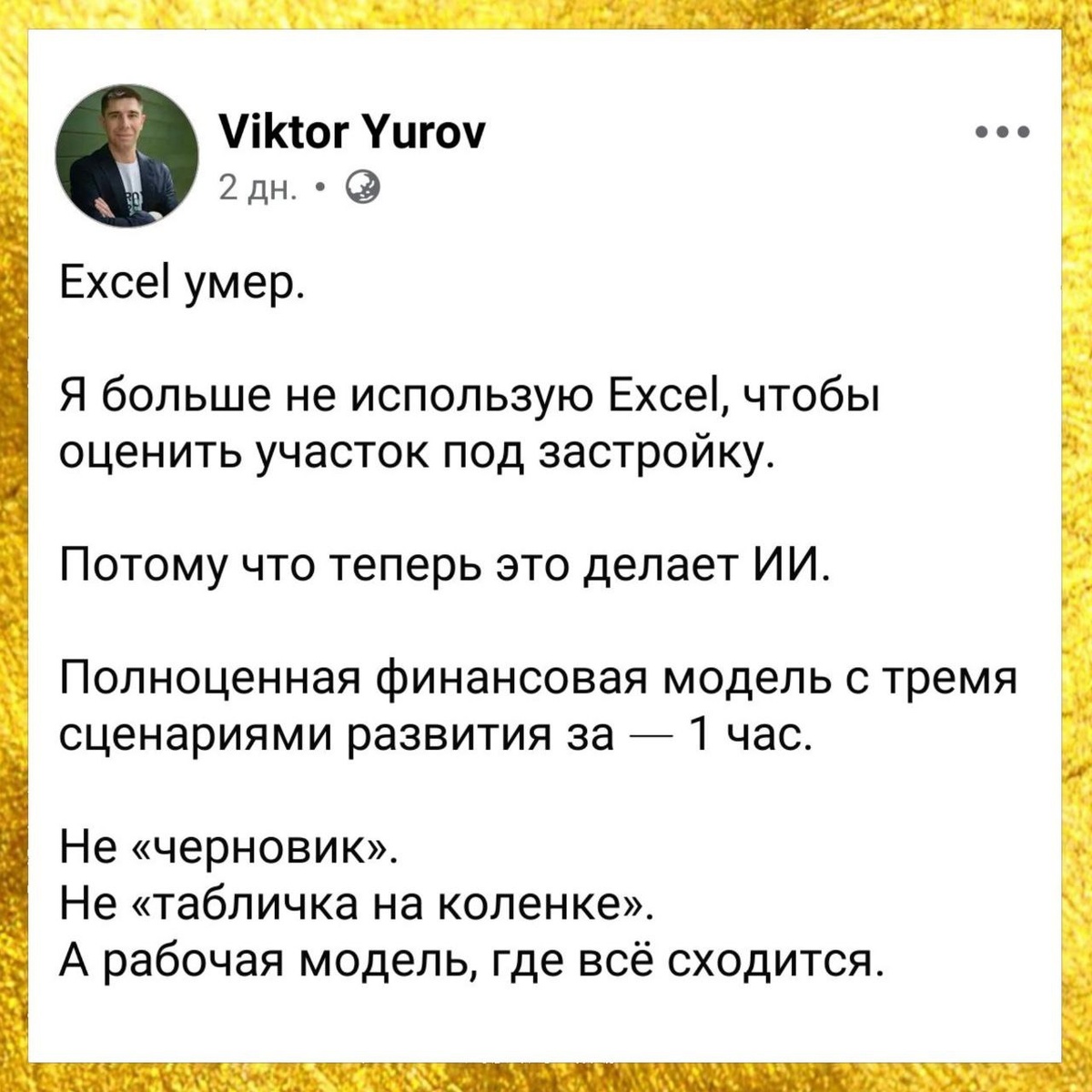 🧮 Как человек, который действительно создает настоящие финансовые модели, могу сказать: это откровенная ложь. И даже не так: это просто звездёж. ⚙️ Чтобы создать фин.модель девелоперского проекта нужно глубочайшее понимание проекта, рынка, финансирования, специфики и т.д. ☝️Есть такое выражение: «плохое ТЗ, результат ХЗ». Так и здесь. Невозможно написать промпт в две строчки приложив принтскрин объявления в Авито и получить нормальный результат в виде фин.модели. Там будут такие ошибки в предпосылках (исходных данных), которые придется два дня исправлять! 🤖 ИИ может помочь с шаблоном (хотя лучше делать в своём) или ускорить рутинные расчеты, но заменить финансового аналитика или того, кто ставит задачу финансовому аналитику ИИшка не может. 🤬 Посылайте подальше всех этих магов и волшебников, у которых умер Excel. ⚠️ ИИ хорошая история, но далеко не для всех задач. Пока что.