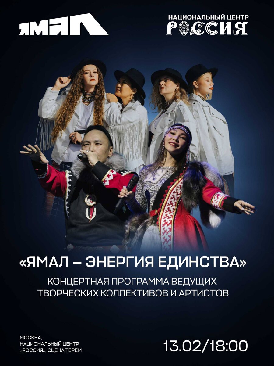 🔥 На сцене Национального центра «Россия» ведущие творческие коллективы и артисты Ямала представят концертную программу, объединяющую традиции народов Севера и энергию будущего. Зрителей ждут грациозные образы северной природы, ритмы стихий, аутентичные костюмы и уникальная энергетика ямальской культуры. Приглашаем поддержать наших участников 13 февраля в 18:00 в Москве, Национальном центре «Россия». Вход бесплатный. Зарегистрироваться здесь. 👍 в ВК | MAX