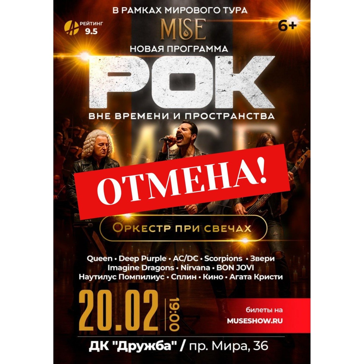 ! Организатор уведомляет об отмене концерта оркестра MUSE “Рок вне времени и пространства”, запланированный на 20 февраля. По вопросу возврата билетов просим обращаться к организаторам концерта: 8 (800) 444-02-05. https://t.me/show_muse - ВК @muse_podderzhka – Телеграм