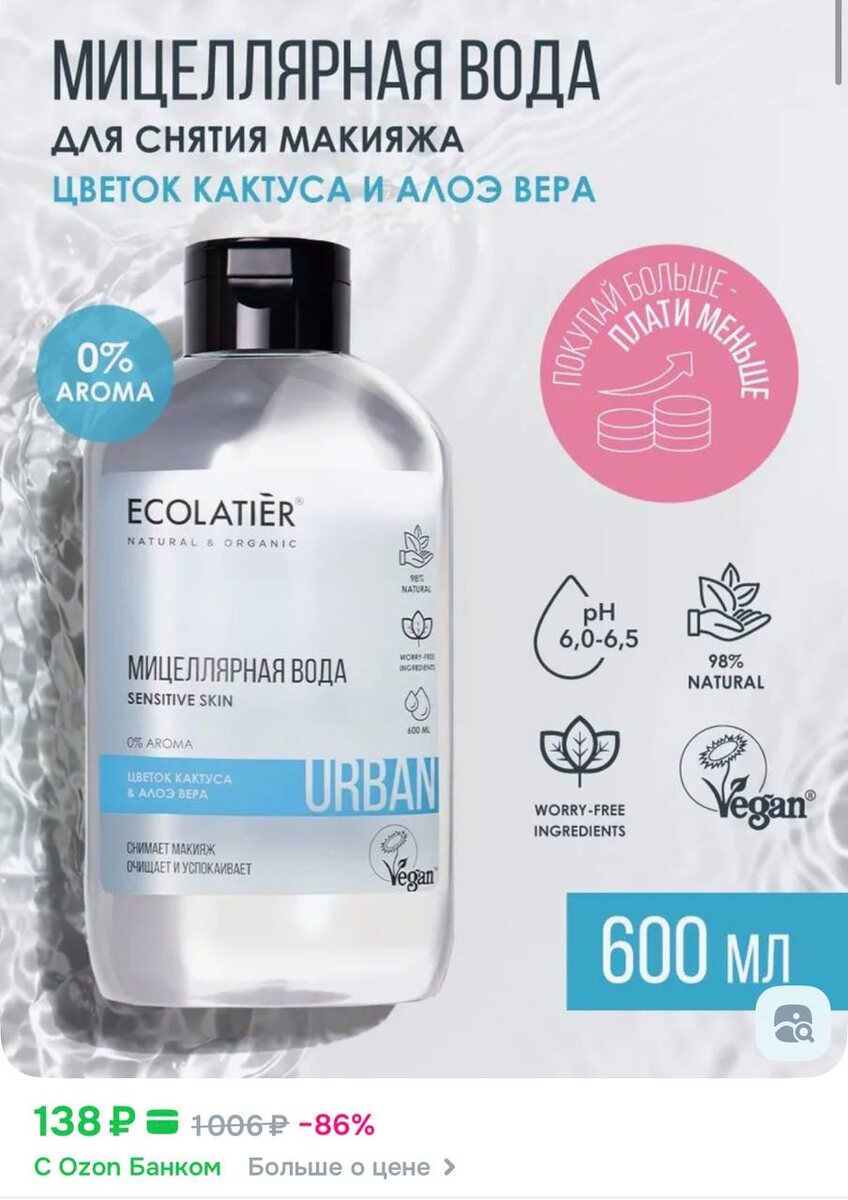 ! У меня получается 103₽ ECOLATIER / Мицеллярная вода для снятия макияжа Цветок Кактуса и Алоэ Вера, 600 мл https://ozon.ru/t/3h9Rydl ✅ Канал по скидкам 🔣 Бот с промокодами