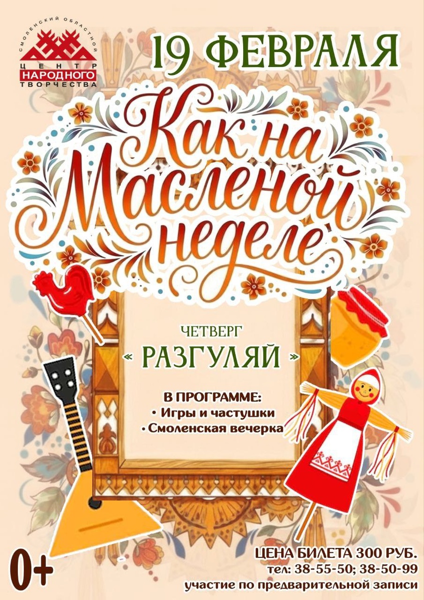 ! 🥞 🤗19 февраля приглашаем на самый весёлый и шумный день масленичной недели. В программе: 🌞 шуточные и игровые песни Смоленской области; 🌞 русские народные игры, которые раззадорят и взрослых, и детей; 🌞 бытовые танцы — научимся двигаться в ритме старинной музыки. ❗️Участие по предварительной записи и по набору групп. ❗️Цена билета: 300 руб. 📍Адрес: ул. Бакунина, 3 ☎️Телефоны: 38-55-50, 38-50-99. #СмоленскийЦентрНародногоТворчества