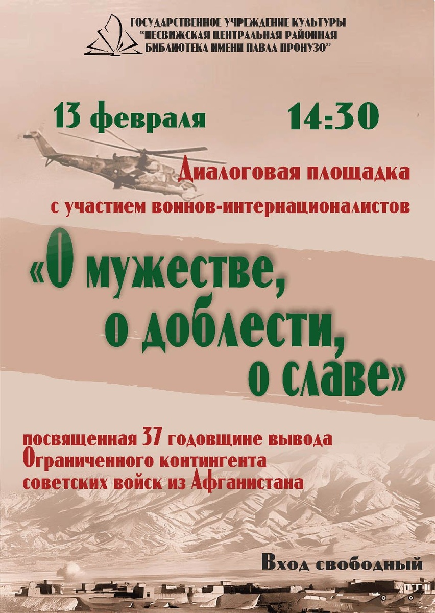 ✔️ Диалоговая площадка с участием воинов-интернационалистов «О мужестве, о доблести, о славе» 📍 Несвижская центральная районная библиотека им. П. Пронузо (г. Несвиж, ул. Белорусская, д. 5)