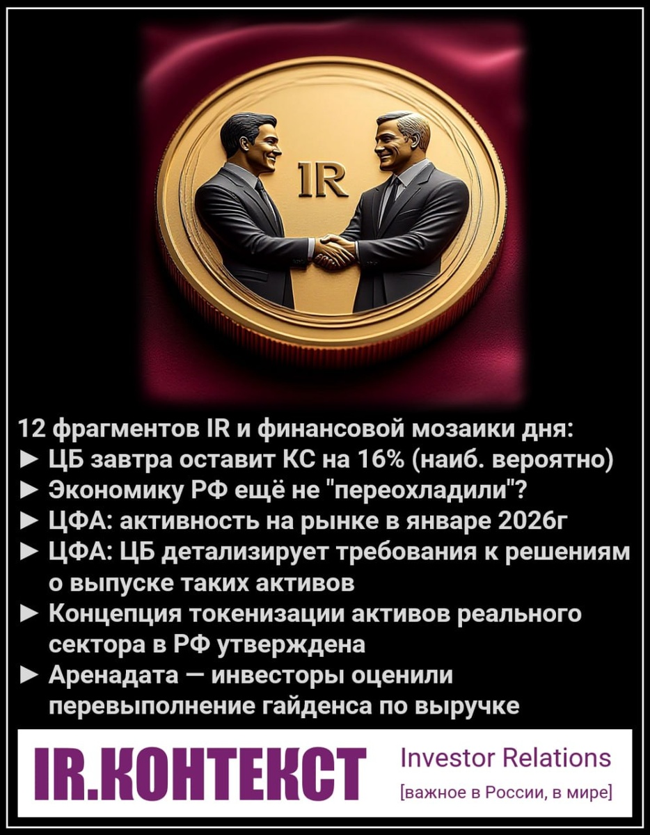 Заседание является опорным и будет сопровождаться публикацией обновленного макроэкономического прогноза. Рынок сместил фокус с разового решения на среднесрочную траекторию ДКП. Ускорение инфляции в январе носит преимущественно разовый характер (повышение НДС, индексация тарифов), что дает ЦБ пространство для осторожного смягчения. При сохранении ставки риторика, скорее всего, останется жесткой. Ключевым сигналом станет пересмотр прогноза по инфляции и средней ставке на 2026–2027 годы. (Интерфакс)