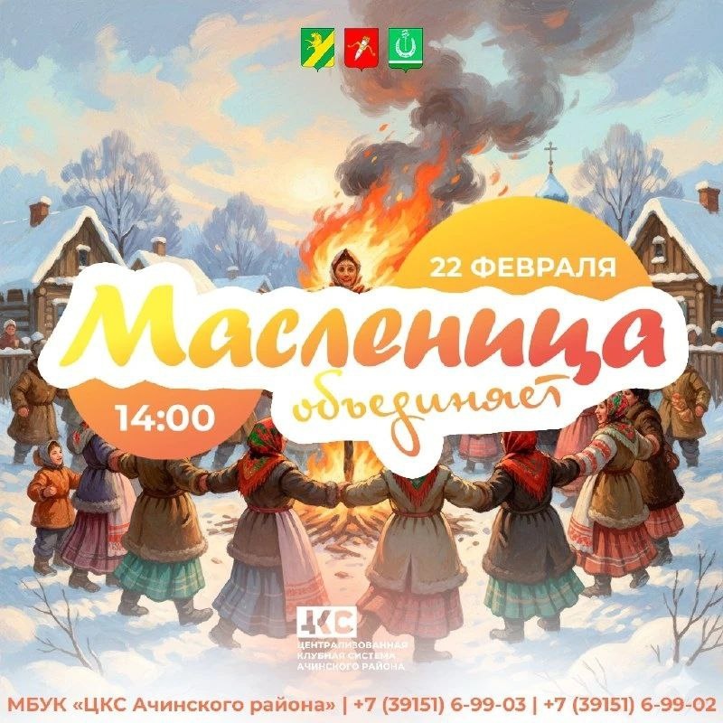 !» Это прекрасная возможность провести время в кругу семьи и друзей, окунуться в атмосферу старинного русского праздника и вместе проводить зиму! В программе: - подворья культурно-досуговых учреждений МБУК «ЦКС Ачинского района» — погрузитесь в атмосферу старинного русского быта, узнайте о народных обычаях и традициях, сделайте фото в этнографическом уголке. - румяные блины с разными начинками и горячий чай; - весёлые народные игры и забавы для детей и взрослых; - хороводы и пляски; - выступления местных творческих коллективов — песни и танцы в народном стиле; - торговые ряды — загляните за сувенирами, изделиями народных промыслов, домашними заготовками и другими приятными мелочами; - мастер-классы по традиционным ремёслам — попробуйте себя в рукоделии. Начало в 14:00. Праздник состоится 22 февраля на площади Малиновского КДЦ по адресу: п. Малиновка, квартал 1, строение 4. 🇷🇺 Запад24 в MAX ™️Запад 24 в ВК 🌐Наш сайт