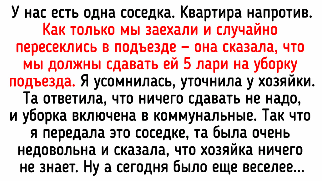 У нас есть одна соседка. Квартира напротив. Как только мы заехали и случайно пересеклись в подъезде — она сказала, что мы должны сдавать ей 5 лари на уборку подъезда. Я усомнилась, уточнила у хозяйки. Та ответила, что ничего сдавать не надо, и уборка включена в коммунальные. Так что я передала это соседке, та была очень недовольна и сказала, что хозяйка ничего не знает. Ну а сегодня было еще веселее. Мы случайно встретились с ней в лифте. И она начала говорить, что ее спальня граничит с нашей кухней. И мы там двигаем стулья, и ей мешает. Так что мы должны купить накладки на ножки стульев. Только вот наша кухня абсолютно никак не соприкасается с ее квартирой. На что я ей указала, но она непрошибаемая — я знаю, какая у вас там планировка, я тут 10 лет живу. А я вот живу и вижу, что кухня посреди нашей квартиры (140м, к слову). И если вдруг она не живет в спальне одного из моих детей — то слышать движение стульев не может. © yuliyakernazhytskaya