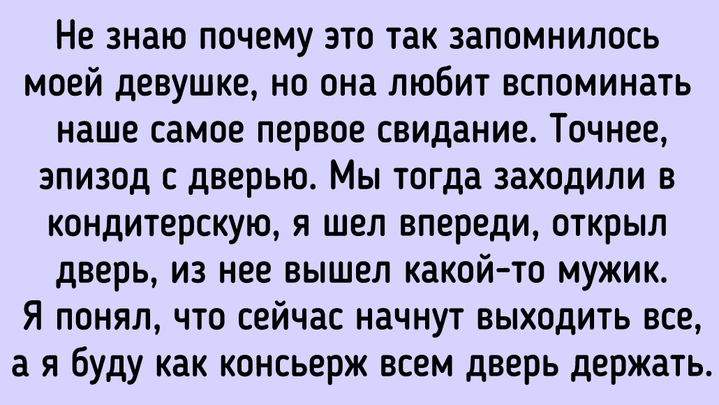 Не знаю почему это так запомнилось моей девушке, но она любит вспоминать наше самое первое свидание. Точнее, эпизод с дверью. Мы тогда заходили в кондитерскую, я шел впереди, открыл дверь, из нее вышел какой-то мужик. Я понял, что сейчас начнут выходить все, а я буду как консьерж всем дверь держать. Дабы избежать этого, я быстро зашел сам — вот и все. Ну, да, потом я растерялся и забыл придержать дверь еще и ей, ну что тут такого? Но у девушки этот момент вызывает дикий приступ смеха. Она, еле дыша, говорит: «Ты просто настолько мило открыл и придержал дверь для того мужика», и опять хохочет во всю.
