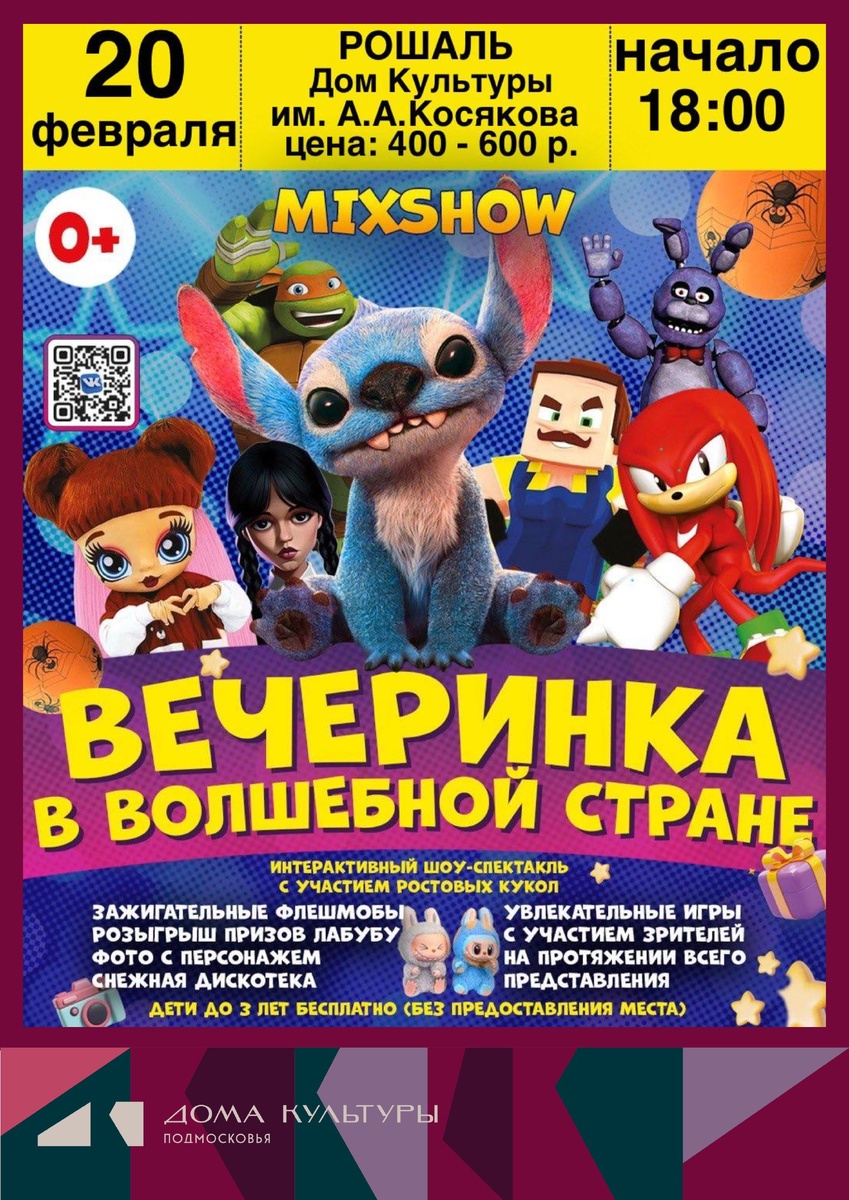 🤗 Приглашаем вас за положительными эмоциями на интерактивный шоу-спектакль с участием ростовых кукол «Вечеринка в волшебной стране»! 👍ВАС ЖДЁТ: Бони, Ехидна Наклз, очаровательная Уэнсдей, «Привет Сосед»! 😀А ТАКЖЕ: снежная дискотека, лазерная анимация, зажигательные флешмобы, игры со зрителем на протяжении всего шоу, продажа сувениров, розыгрыш призов и, конечно же, фото с любимыми персонажами! 🍡В продаже: сладкая вата, карамельный попкорн, сувениры…🍥 ⚡РОШАЛЬ 📌20 февраля, 18:00 📍Дом культуры имени А.А. Косякова (ул. Косякова, д. 7) ⚠️Купить билет можно по ссылке: https://clck.ru/3Rm58p ❗Стоимость билета от 400 до 600 рублей. Дети до 3-х лет бесплатно без предоставления места.❗ ✴️Окунитесь в яркий отдых всей семьей! #Рошаль #НашеПодмосковье #КультураШатураРошаль #КультураБольшаяШатура #Культура #ЗимаВПодмосковье #ДККосякова #ГоспабликиМО #БольшаяШатура