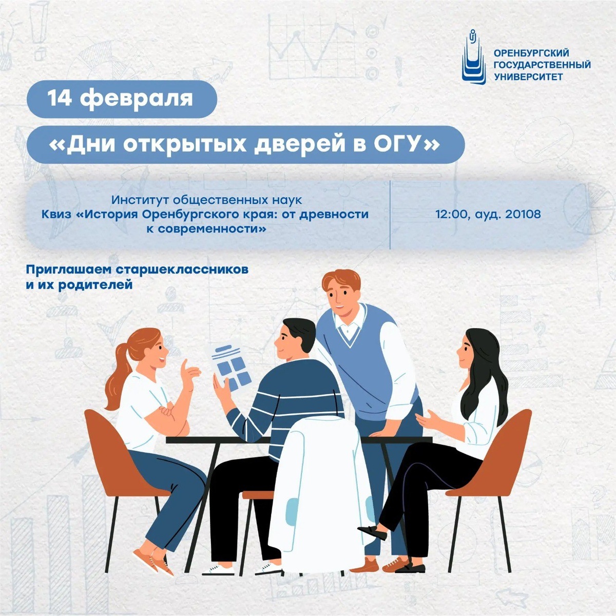 ! 🌐 В эту субботу, 14 февраля, ОГУ приглашает школьников и родителей на профориентационные мероприятия. Институт общественных наук проведёт День открытых дверей, где гостей ждёт увлекательный квиз по истории Оренбургского края. Тематические площадки «Университетских суббот» развернутся сразу в четырёх подразделениях: ☀️ Аэрокосмический институт познакомит с компьютерным моделированием; ☀️ Институт менеджмента, экономики и предпринимательства приглашает на деловую игру; ☀️ Институт наук о Земле раскроет тайны геологического музея; ☀️ физический факультет покажет возможности лазерных технологий. Ждём именно тебя! ВАЖНО: для входа в учебные корпуса необходим паспорт РФ. 📌 Подробное расписание всех «Университетских суббот»: www.osu.ru/doc/4182 📞 По вопросам участия: (35-32) 37-25-55. #ОГУ #в_ОГУ #OSU #УниверситетскиеСубботы