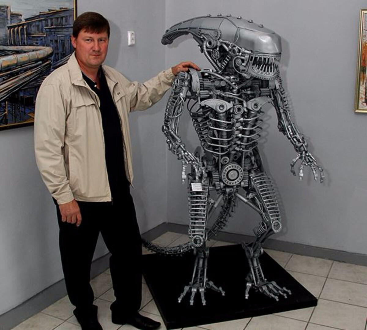 Кузбасский горняк-скульптор создал металлическую копию ксеноморфа из фильма "Чужой" 28 Сентября 2017, На выставке "Шахтерский характер", завершившейся в Белове, мастер одного из угольных разрезов Владимир Гранкин представил металлическую скульптуру, изображающую персонажа фильма "Чужой". В интервью газете "Беловский вестник" горняк рассказал, что на создание ксеноморфа его вдохновило творчество таиландского мастера Суджая – автора скульптуры "Хищника", установленного у кемеровского кинотеатра "Космос". Скульптура весом 170 кг состоит из соединенных сваркой деталей. "Чужой" Владимира Гранкина может менять позы у него подвижны голова и руки. – Работа над скульптурой оказалась трудоемкой, но сил не жалел, потому что решил, что мой персонаж будет копией киношного героя. В дело пошли подшипники, цепи, клапаны, кулачки, свечи, кузовные запчасти от старенькой "Лады", ЗИЛа, "Москвича" и другой отслужившей техники, – поделился автор творения и признался, что на создание скульптуры не ушло ни