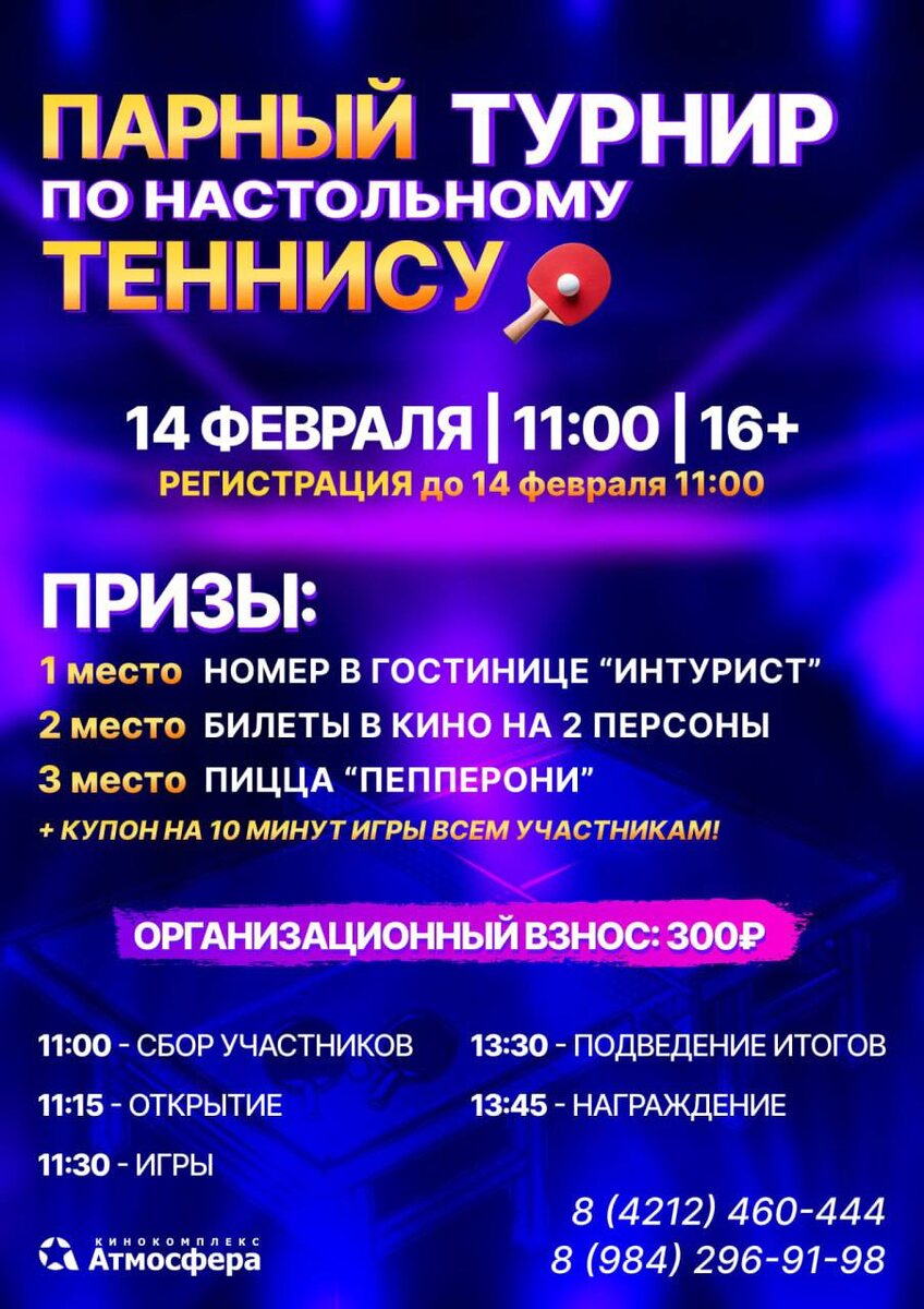 ✔ Турнир для пар в формате настольного тенниса ✔ Проведение в День всех влюблённых — активный и азартный досуг ✔ Призы: номер в «Интурист», билеты в кино на двоих, пицца «Пепперони» ✔ Каждый участник получает дополнительные 10 минут игры ✔ Взнос за участие: 300 ₽, обязательная регистрация до начала 📅 Когда: #14_февраля в 11:00 ⛳ Где: Кинокомплекс «Атмосфера» 💳 Стоимость: 300 ₽ 📞 Контакты: 8 (4212) 460-444, 8 (984) 296-91-98 👉 Афиша Хабаровска. Куда сходить, экскурсии