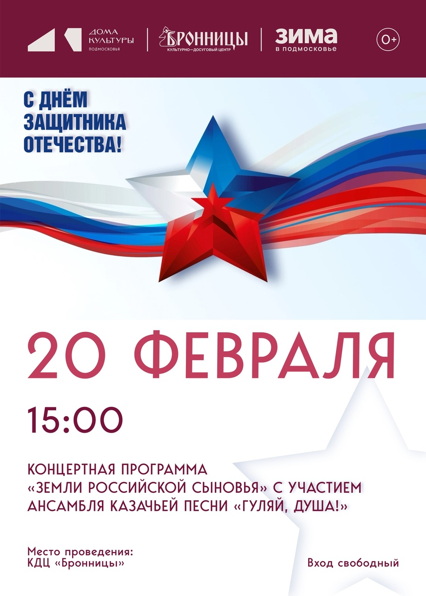 20 февраля в 15:00 в Культурно-досуговом центре города Бронницы пройдет торжественный концерт, приуроченный к празднованию Дня защитника Отечества, под символичным названием "Земли российской сыновья". На сцене выступят как местные творческие коллективы, так и приглашенные артисты - Ансамбль казачьей песни "Гуляй, душа!". Данное мероприятие призвано подчеркнуть значимость патриотических традиций и культурного наследия России, а также выразить глубокую благодарность и уважение к военнослужащим и ветеранам, которые своим служением обеспечивают безопасность и стабильность государства. Любовь Нечипоренко