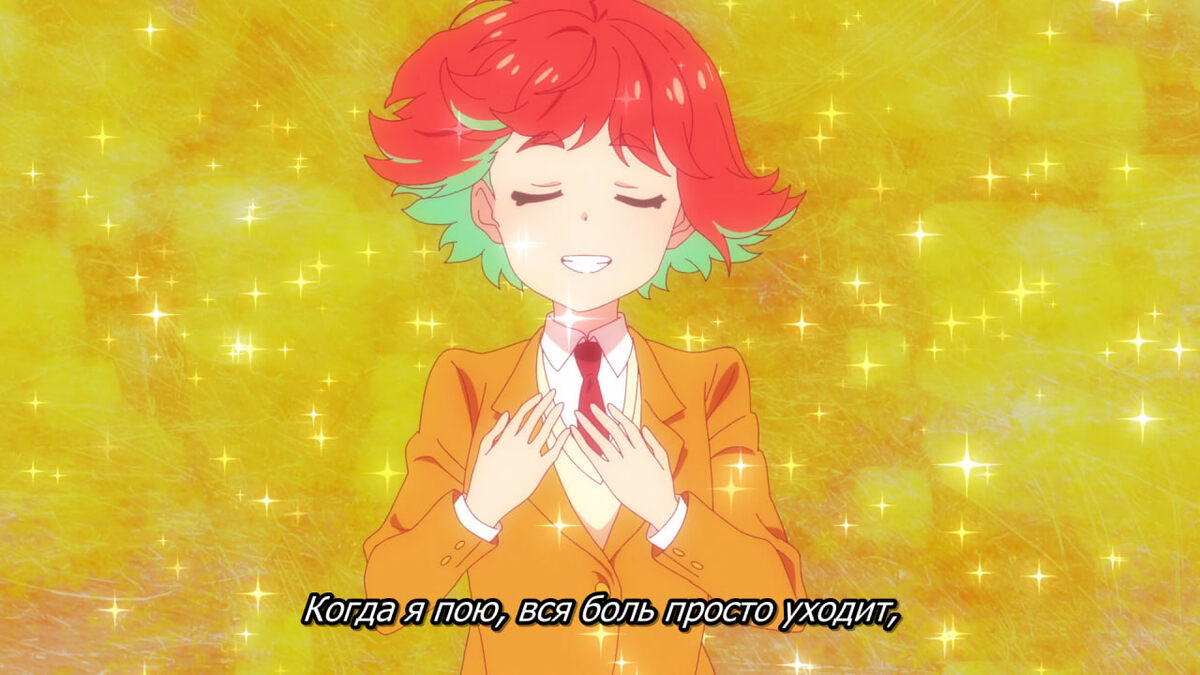 В другом аниме, «Музыкальная школа звезд» (Star-Myu, 2015), вокальные номера объяснены так: герои учатся на актеров мюзикла. При этом повествование часто переходит в аудиальную форму, чтобы подчеркнуть конфликты. Сюжетное обоснование есть и в сериале Healer Girl (2022) режиссера Ясухиро Ириэ. В показанном мире пение стало формой лечения наряду с обычной медициной. Когда девушки-целительницы срываются в вокальный номер, такое «врачебное» объяснение пусть и не избавляет зрителей-реалистов от испанского стыда, но по крайней мере соответствует заявленному лору. Сериал недооценен, возможно, как раз из-за технических ограничений ТВ-формата: сцены пения амбициозно поставлены, но, по-хорошему, требуют более высококачественной анимации.