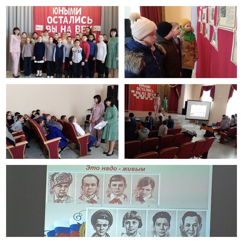 В рамках месячника оборонно-массовой работы, накануне дня юного героя антифашиста, в Греково-Тимофеевском СДК совместно с библиотекой, для учащихся 2-5 класса Греково-Тимофеевской сош провели урок мужества «Юными остались навсегда». В интересной форме для ребят был подготовлен рассказ о мальчишках и девчонках, которые за подвиги, совершённые в годы Великой Отечественной войны, были удостоены самой высокой награды Родины — звания Героя Советского Союза. Школьники с интересом слушали рассказ о своих ровесниках: Лёне Голикове, Зине Портновой, Марате Казее, Вале Котике и других пионерах-героях, чей подвиг навеки останется в памяти поколений. Урок мужества сопровождался показом презентации «Безусые герои» и обзором книг, представленных на выставке-подвиге «Маленькие герои большой войны». Хочется верить, что в памяти ребят навсегда останутся имена юных солдат, с биографиями которых они познакомились на мероприятии. Греково-Тимофеевский СДК Н.Н. Чайкова