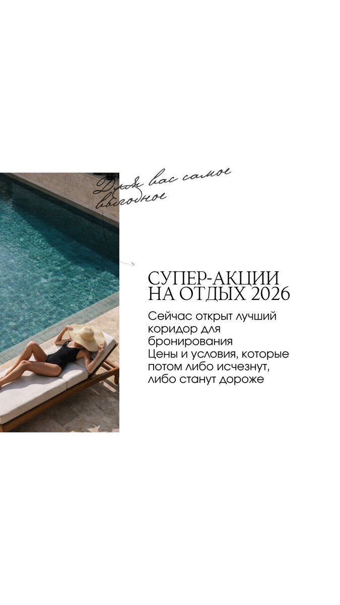 Сейчас открыт лучший коридор для бронирования отдыха на 2026 год. Отели и операторы фиксируют условия, которые позже либо исчезнут, либо станут дороже. Для вас уже собраны актуальные акции и спецпредложения 👇 🔹ДЕТИ БЕСПЛАТНО В ТУРЦИИ 🇹🇷 Corendon Hydros Club Kemer 5* Бронируете номер Comfort Room ROH для двоих взрослых и двое детей отдыхают бесплатно. Условия: • вылеты: все города • бронирование: 30.01.2026 – 28.02.2026 • проживание: 01.05.2026 – 31.10.2026 🔹СПЕЦПРЕДЛОЖЕНИЕ В ОАЭ 🇦🇪 Five Luxe 5* Новый уровень отдыха и приятные бонусы: • бутылка просекко по прибытии • расширенный Dine Around (22 ресторана сети FIVE) • батлер-сервис Условия: • вылеты: все города • бронирование: 03.02.2026 – 14.02.2026 • проживание: 15.02.2026 – 31.05.2026 🔹ЮЛИЯ ПАРШУТА: КОНЦЕРТ К ДНЮ ВЛЮБЛЁННЫХ 💘 Sunrise Hotels, Египет Бесплатный вход на концерт Юлия Паршута в Шарм-эль-Шейхе. Для гостей Sunrise: • бесплатный вход • трансфер туда и обратно • 1 напиток Для Sunrise Posh Club: • VIP-зона • индив