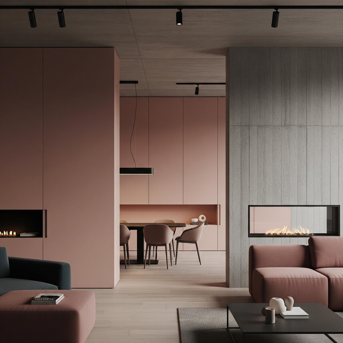 На нейтральном фоне оттенок может растворяться. Рядом с бетоном — он собирается. Грубая поверхность не смягчает цвет и не украшает его. Она задаёт сопротивление. И именно за счёт этого цвет начинает звучать глубже и точнее. Бетон делает оттенок: — плотнее — спокойнее — архитектурнее Он убирает декоративность и оставляет только взаимодействие цвета и формы. В таких сочетаниях цвет перестаёт быть «уютным». Он становится структурным элементом пространства. В следующем выпуске OIKOS Interior Journal посмотрим, как сложные оттенки работают в интерьерах с металлом — когда цвету приходится держать индустриальный ритм. #стильлофт #бетонныестены #пыльнаяроза