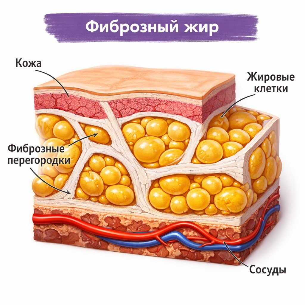 ... Продолжение С ЧЕМ РАБОТАЕТ РУЧНАЯ ЛИПОСАКЦИЯ 1️⃣ ФИБРОЗНЫЙ ЖИР Это не просто жировая ткань Она: 🔻 плотная и малоподвижная 🔻 формируется годами 🔻 слабо реагирует на питание и физическую нагрузку 🔻 часто образует «упрямые зоны» Такой жир удерживается в тканях за счёт плотных соединительнотканных перегородок. Откуда он берётся ⤵️ У многих он начинает формироваться ещё в период полового созревания - в подростковом возрасте по причине гормональных изменений. А дальше, с годами, он может: 🔻 уплотняться 🔻 «обрастать» соединительной тканью 🔻 терять эластичность 🔻 фиксироваться в определённых зонах ❗️Поэтому такие участки: 🕺 плохо поддаются коррекции 🕺 сохраняют форму годами 🕺 становятся теми самыми «упрямыми зонами»