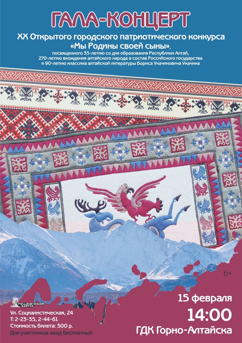 », посвященного 35-летию со дня образования Республики Алтай, 270-летию вхождения алтайского народа в состав Российского государства и 90-летию классика алтайской литературы Бориса Укачиновича Укачина. В программе примут участие победители конкурса. Обращаем ваше внимание, что билет можно приобрести по программе Пушкинская карта.