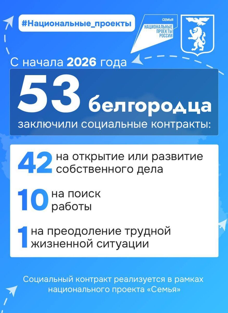 С начала года уже 53 белгородца заключили социальные контракты. 42 – на открытие или развитие собственного дела, 10 – на поиск работы, ещё один – на преодоление трудной жизненной ситуации. «Социальный контракт, реализуемый в рамках национального проекта «Семья», даёт возможность опереться на помощь государства, чтобы начать своё дело, найти работу или выйти из сложного положения. Это не просто выплата, а поддержка, которая помогает двигаться дальше», — отметил мэр Валентин Демидов. Подать заявление на заключение соцконтракта можно тремя способами: 🔹через портал Госуслуг; 🔹лично в МФЦ; 🔹в органах социальной защиты населения. О том, куда обращаться за детальной консультацией – в карточках. Мэрия|Белгород в 📱 ТГ 📱 ВК 💜 MAX