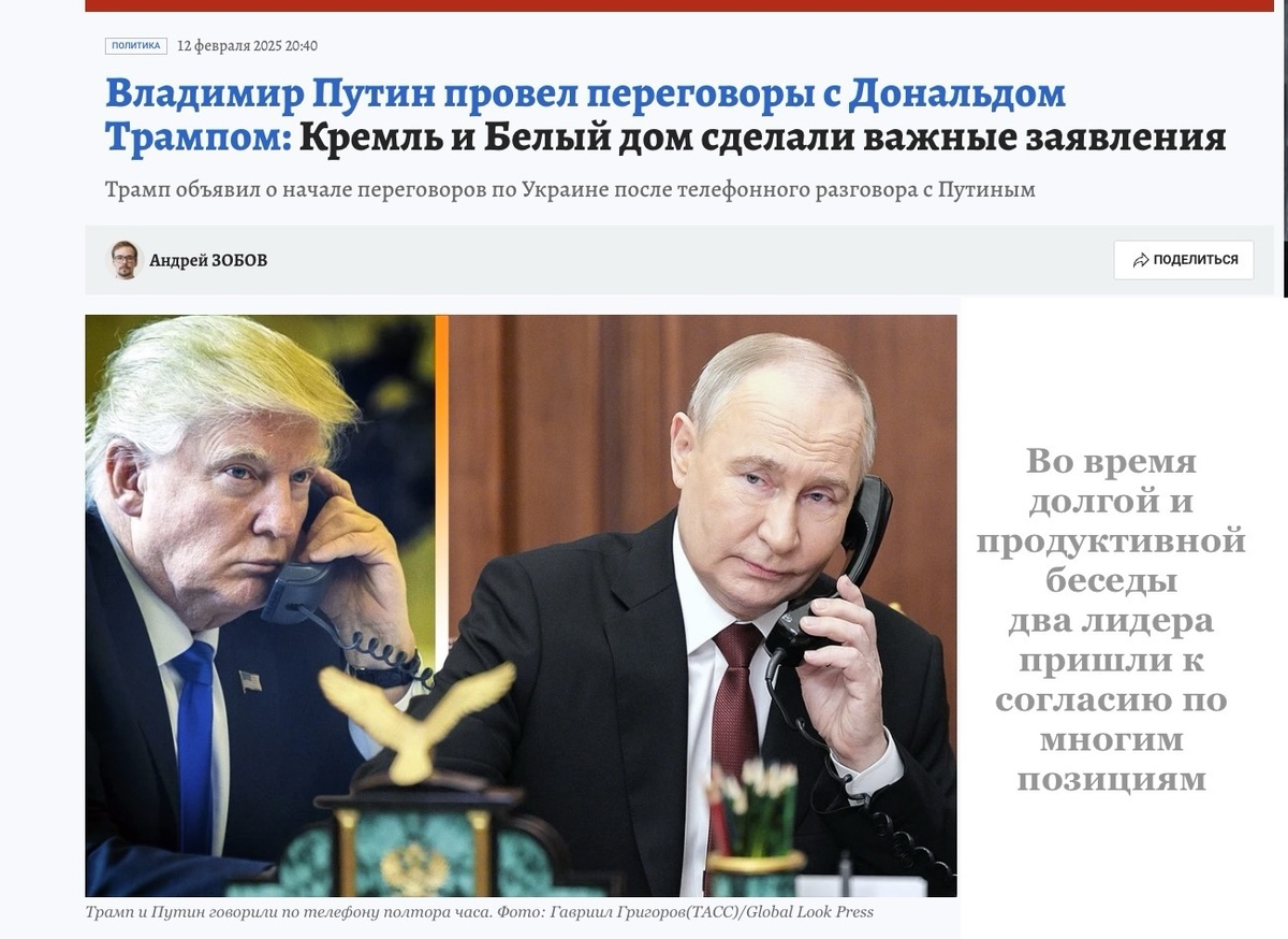 12 февраля 2025 года лидеры двух стран впервые созвонились после того, как Трамп вступил в должность президента США. Хроника СВО. День за днём. Что происходило 12 февраля в 2022, 2023, 2024 и 2025 годах