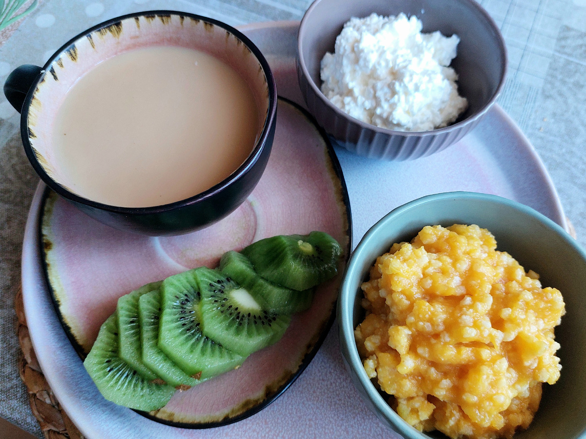 На фото нет только капусты. Я отрезаю щедро кусочек и пока готовлю завтрак, капусты уже нет. А так здесь и белок, и углеводы, и овощи. Все, как надо.