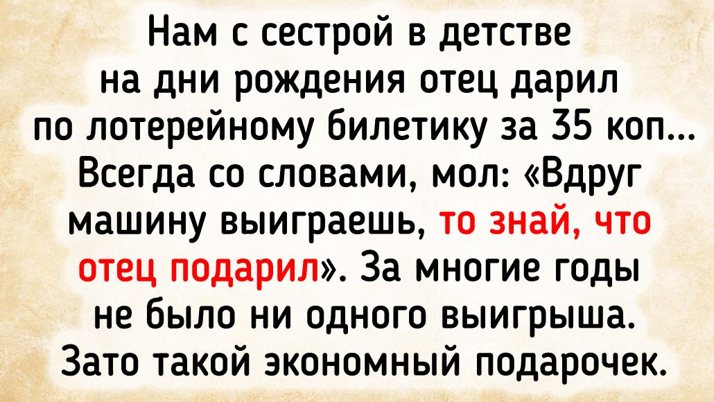Нам с сестрой в детстве на дни рождения отец дарил по лотерейному билетику за 35 копеек. Всегда со словами, мол: «Вдруг машину выиграешь, то знай, что отец подарил». За многие годы не было ни одного выигрыша. Зато такой экономный подарочек. © Татьяна Иванова / ADME