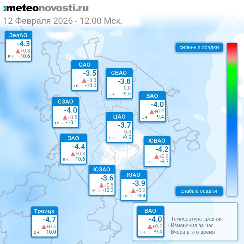 В 12:00 в Москве было от -4.8°C до -2.7°C, средняя температура -3.9°C #погода #Москва #зима #температура #12февраля #четверг