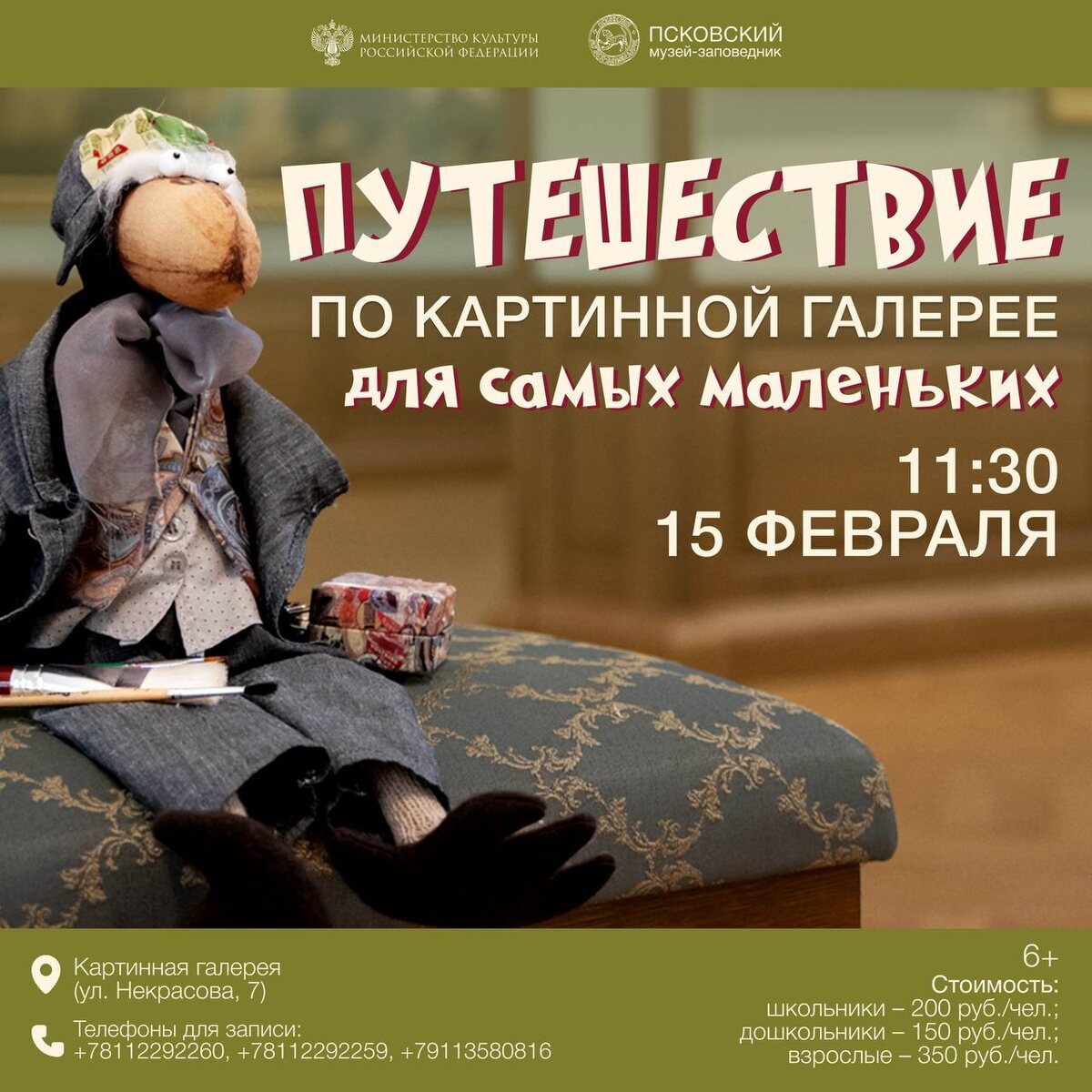 🐦⬛️ 📜 Псковский музей-заповедник приглашает детей и родителей на цикл встреч «Путешествие по Картинной галерее для самых маленьких» (6+). Каждое занятие – знакомство с шедеврами Псковской картинной галереи по определенной теме в форме увлекательной беседы с элементами игры и дополнительным творческим заданием. ⚡️ Проводником в мир прекрасного станет опытный путешественник и истинный любитель искусства ворон Марк. В это воскресенье тема занятия – скульптура. 📆 15 февраля (вс) в 11:30. 📍 Картинная галерея (ул. Некрасова, 7). 🎟 200 руб./чел. – школьники, 150 руб./чел. – дошкольники, 350 руб./чел. – взрослые. 📞Телефоны для записи: +78112292260, +78112292259, +79113580816. Оставайтесь с нами #НашаПсковскаяобласть