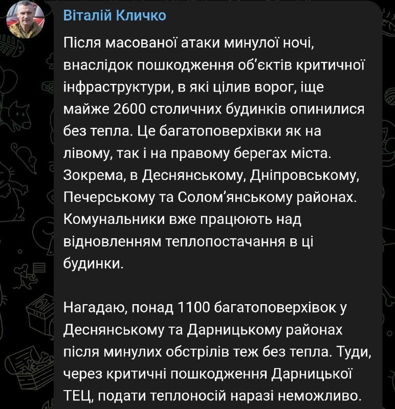▪️ Мэр Кличко сообщил: 2600 из них находятся в Деснянском, Днепровском, Печерском и Соломенском районах. ▪️ Еще 1100 домов в Деснянском и Днепровском районах не могут получить тепло из-за последствий прошлых атак. ▪️ Повреждена критическая инфраструктура столицы, отметил Кличко. Подписывайся