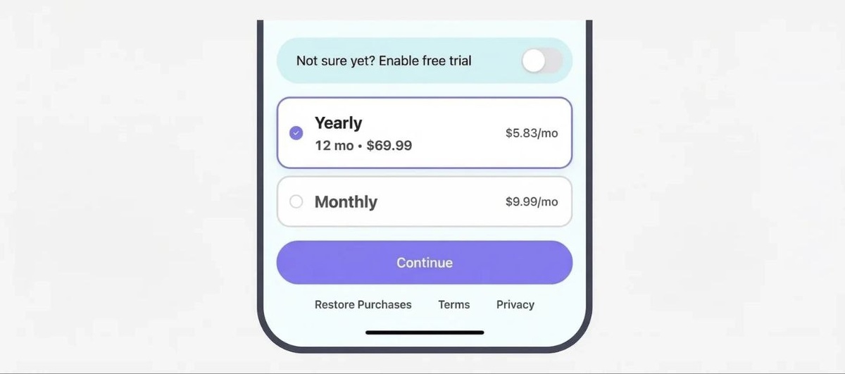 Это темный паттерн, который удваивал выручку приложений за год использования. Суть механики: пользователь видел подписку с тогл-переключателем (по умолчанию выключен). Включаешь — получаешь недельный план с триалом, выключен — видишь годовой без trial. Большинство просто жали Continue, пропуская триал и платя сразу. Результат: конверсия в 63% и огромный рост ARPU. Триал, который нужно включать вручную через скрытый тогл — это не прозрачность, а темный паттерн. С января 2026 Apple массово реджектит приложения с такими экранами в процессе ревью. Официальная причина "дизайн путает пользователей и мешает понять, что они подписываются на автопродление". Реальная причина скорее всего в том, что прием стал слишком популярным и не замечать его стало репутационно невыгодно компании. Важно понимать, что это касается только iOS. На Android и тем более в веб-воронках это продолжает работать. Если проект мультиплатформменный — будут используовать разные пэйволы для разных платформ.